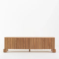 The Elmwood Serenity TV Unit offers a minimalist yet elegant design, crafted from premium Solid wood. Featuring clean lines and subtle detailing, this piece stands as a functional and aesthetically pleasing addition to any living space. The combination of smooth, natural wood tones with distinct vertical slats gives the unit a timeless and modern appeal. It offers ample storage space with multiple compartments, perfect for organizing entertainment devices, media, and other essentials. Supported by sturdy wooden legs, this TV unit ensures durability and stability, making it a perfect blend of style and practicality.