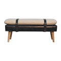 Bring an elevated blend of comfort and craftsmanship to your space with this mixed-material bench that fuses mid-century design with modern sensibilities. The bench features a thick, plush seat cushion upholstered in soft cream bouclé fabric, providing an inviting texture and visual softness. This cushion is secured by two rich leather straps with functional buckles that add a rugged, artisanal touch.