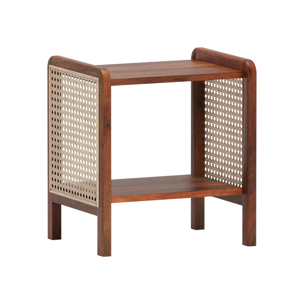 Add a touch of timeless charm to your space with this beautifully crafted natural cane side table. Featuring a solid wooden frame with rounded edges and intricately woven cane panels on three sides, this piece brings warmth, texture, and elegance to any room. The top surface is ideal for displaying decorative pieces or your favorite coffee mug, while the lower shelf offers practical storage for books or accessories. This table perfectly blends modern minimalism with earthy, boho aesthetics—making it a versatile addition to living rooms, bedrooms, or reading books.