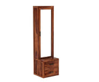 Designed for compact living spaces, this slim contemporary wooden dressing unit brings both functionality and refined style. Crafted from rich natural wood with striking grain patterns, the unit features a tall, full-length mirror framed in matching wood—perfect for daily grooming or last-minute outfit checks. Below the mirror sits a sturdy base with two generously sized drawers equipped with minimalist metal handles, offering convenient storage for cosmetics, accessories, or personal essentials. Its vertical design allows it to fit seamlessly in bedrooms, dressing areas, or entryways, making it a versatile addition to any modern home.