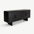 The Textured Black Sideboard combines sleek, modern design with a sophisticated textured surface, making it an eye-catching addition to any living room or dining area. Its rich black finish is complemented by a beautifully crafted surface that features subtle waves, adding depth and interest to its minimalist silhouette. Four spacious compartments with functional handles offer ample storage space, making it perfect for organizing your belongings in style. With its sturdy legs and contemporary design, this sideboard effortlessly blends form and function, enhancing the atmosphere of your home with elegance and practicality.