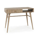 Blending simplicity with subtle elegance, this Scandinavian-inspired wooden writing desk is a perfect addition to any modern or transitional workspace. Crafted from light-toned wood, the desk features a rectangular top supported by sleek, tapered legs with crossbars for added stability. The standout feature is the fluted-front drawer, fitted with a small geometric knob, which offers hidden storage for essentials. Adjacent to the drawer is an open shelf, ideal for keeping notebooks, tech accessories, or decorative items within reach. Compact and stylish, this desk is ideal for home offices, bedrooms, or study nooks where space is limited but style is essential.